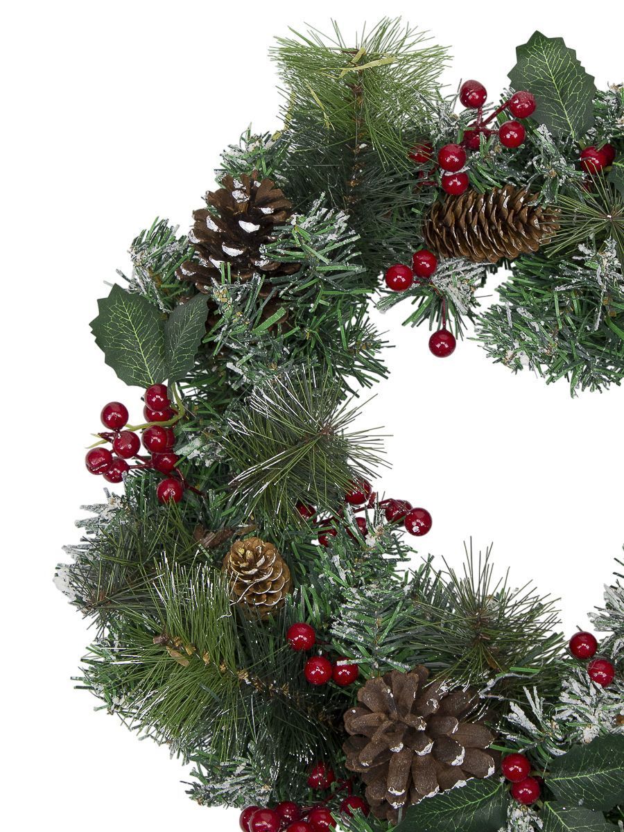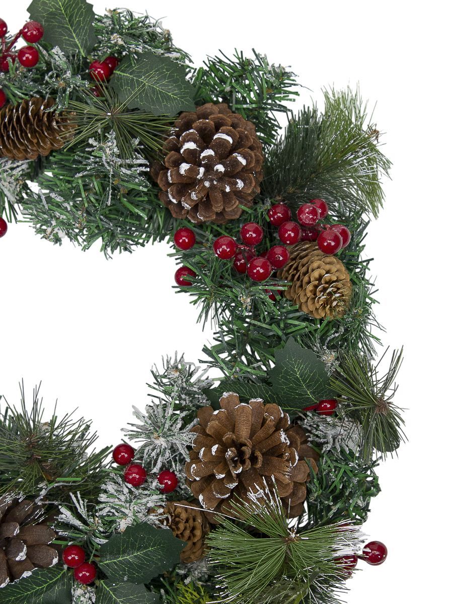 Комбинированный пластиковый венок из хвойных ветвей диаметром около 50 см представляет собой отличное украшение для праздничного сезона. Помимо традиционного вида сосновых или еловых ветвей, венок дополнительно украшен декоративными элементами: натурально выглядящими шишками и яркими ягодами.