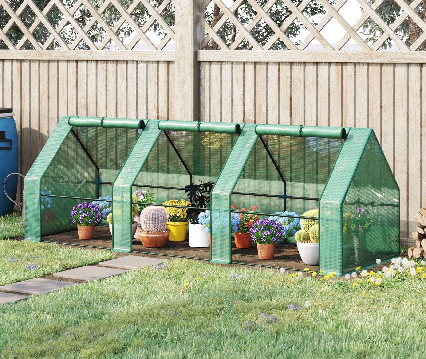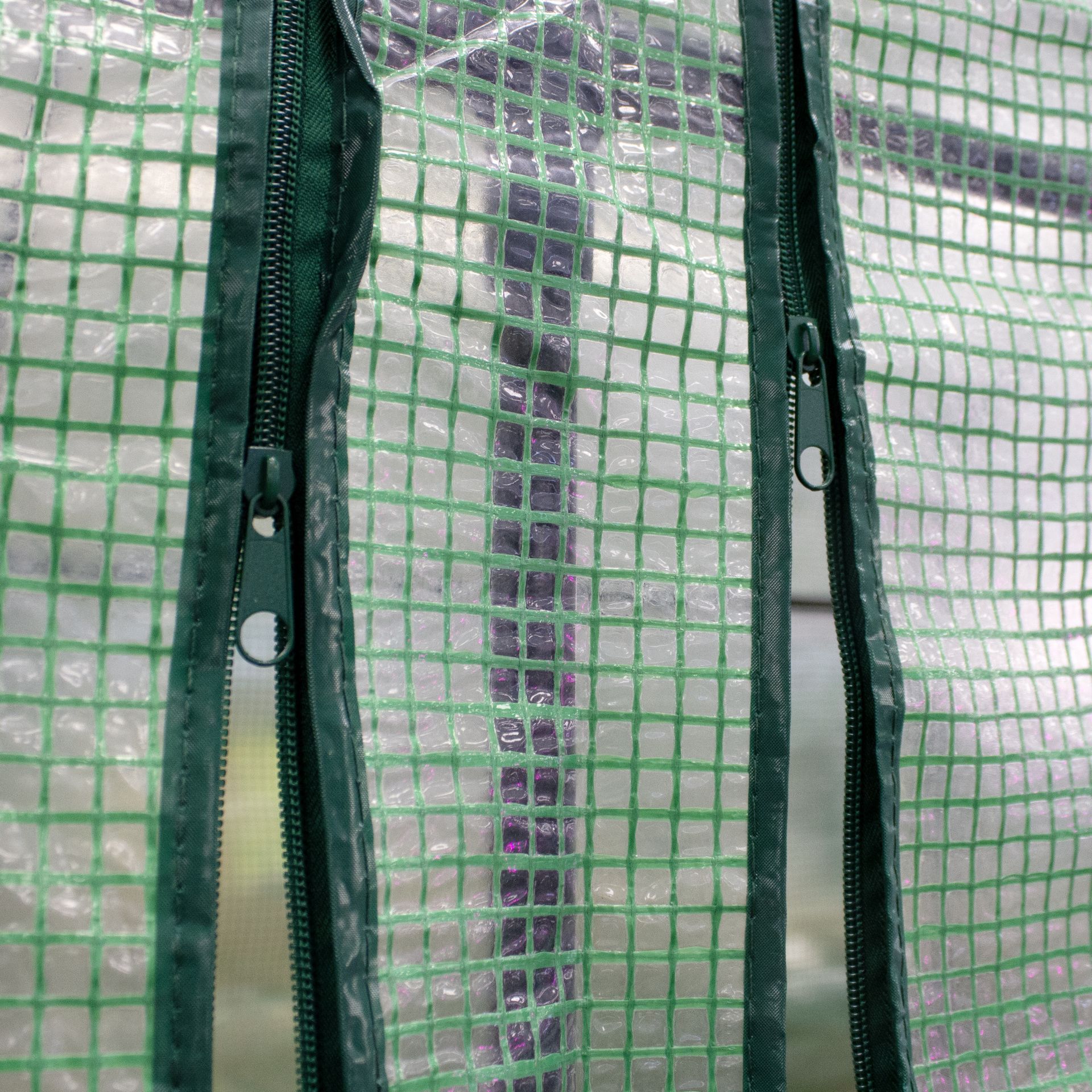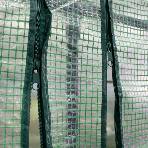 Трубчатая рама диаметром 16 мм с порошковым покрытием полиэтиленовая крышка, устойчивая к ультрафиолетовому излучению, весом 140 г/ПВХ толщиной 0,1 мм Тройные двери на молнии Варианты цвета ЗЕЛЕНЫЙ/БЕЛЫЙ / ПРОЗРАЧНЫЙ Окон нет